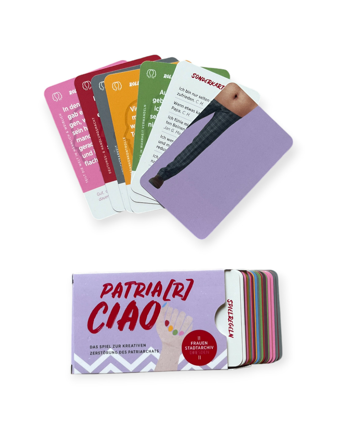 Spielend das Patriarchat besiegen? Das ist möglich und zwar mit dem Kartenspiel PATRIA(R)CIAO. Das Spiel beruht auf einem Zeitzeuginnen*-Projekt des Frauenstadtarchivs Dresden, für das verschiedene Generationen von Frauen* zu ihren ganz alltäglichen und häufig unsichtbaren patriarchalen Erfahrungen und Gegenstrategien in der DDR, Wende- und Nachwendezeit befragt wurden. Während des Spiels begeben sich die Mitspielenden in die Rolle der Zeitzeuginnen* und bekommen mittels der präsentierten Zitate und den dazu erdachten Aktionen nicht nur ein Gespür für die Wirkungsmacht und Funktionsweise des Patriarchats, sondern bekämpfen den sexistischen Normalzustand. Der performative Charakter des Spiels ermöglicht es den Mitspielenden zudem, einer geschlechtergerechten Gesellschaft auch in der Realität ein Stück weit näher zu kommen.