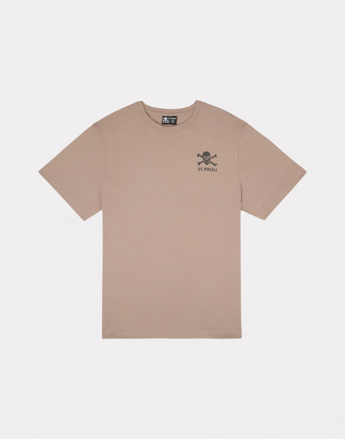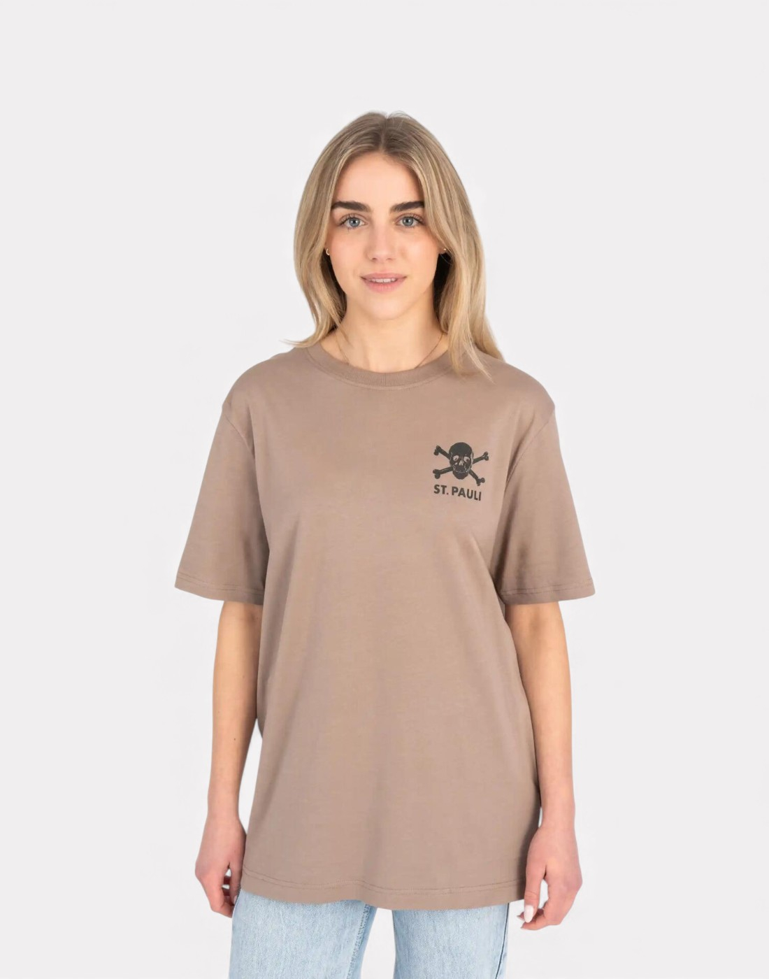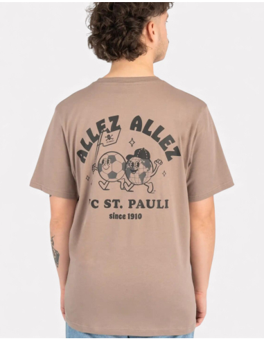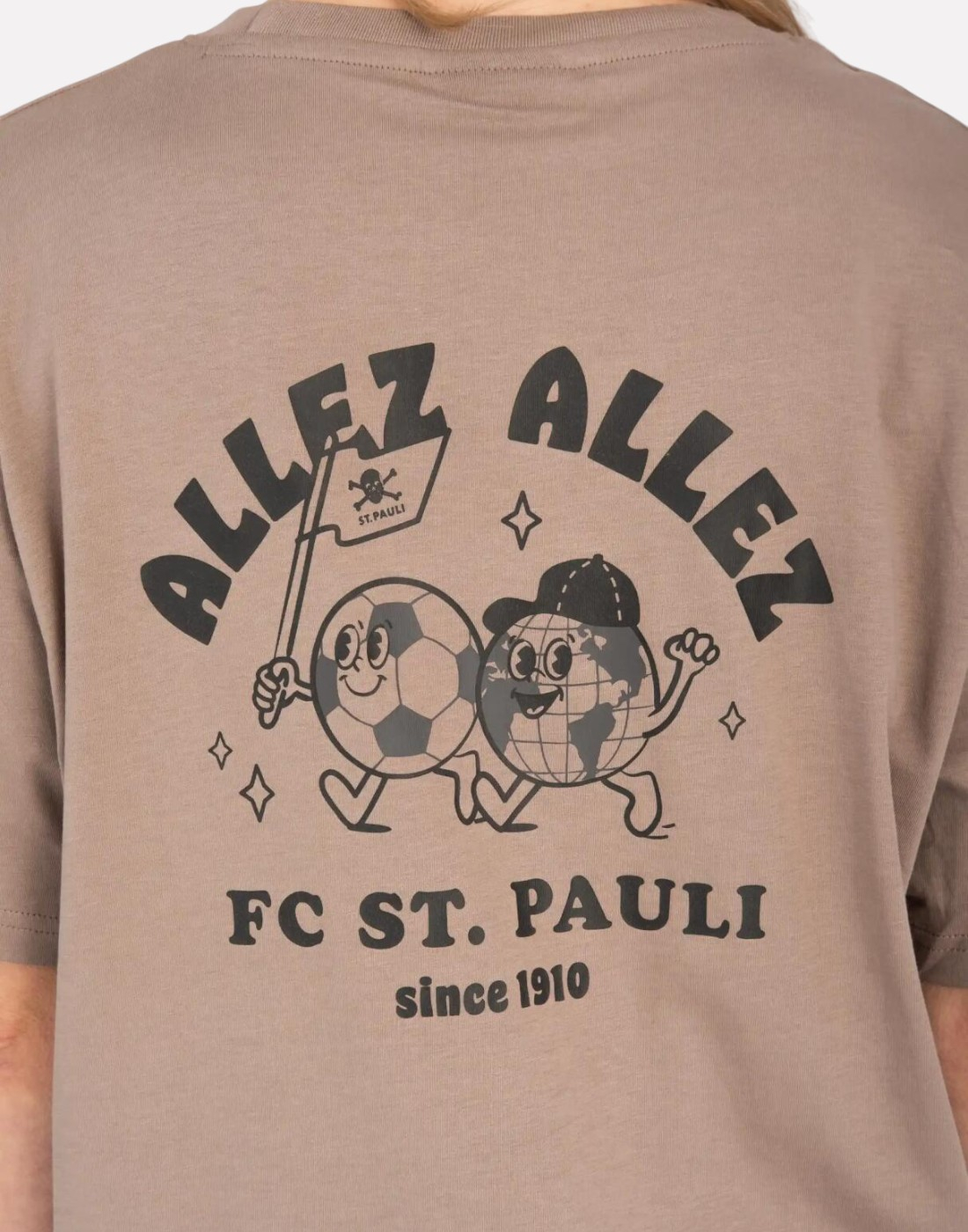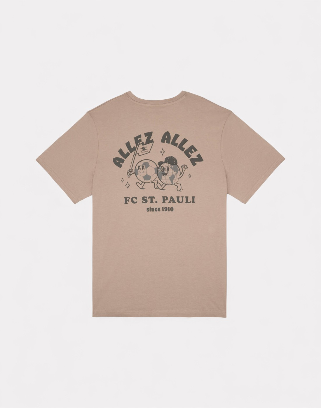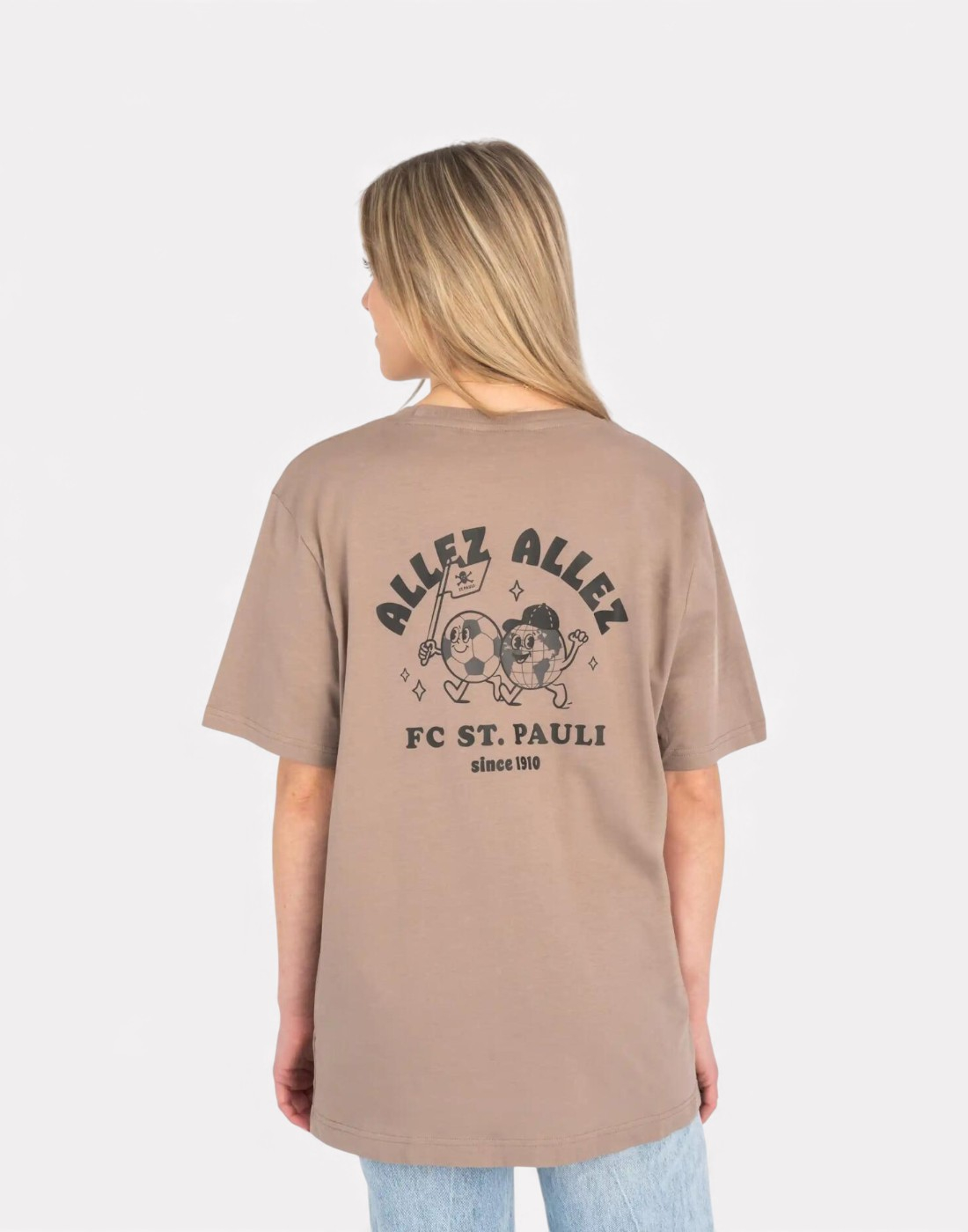 Es gibt keine Artikel mehr in Ihrem WarenkorbKiezkultur zum Anziehen: Das hellbraune FC St. Pauli Shirt kommt vorn mit klassischem Totenkopf in Schwarz, hinten feiern zwei Comic-Figuren unter dem „Allez Allez“-Slogan. Klarer Rückendruck, starker Look – und alles aus 100 % Biobaumwolle. Für alle, die nicht nur singen, sondern auch Haltung tragen. Boys in Brown – since 1910.