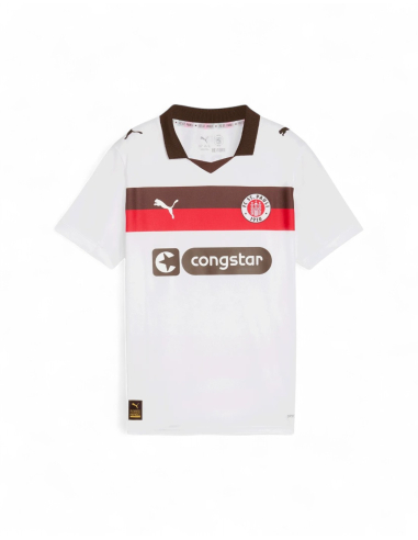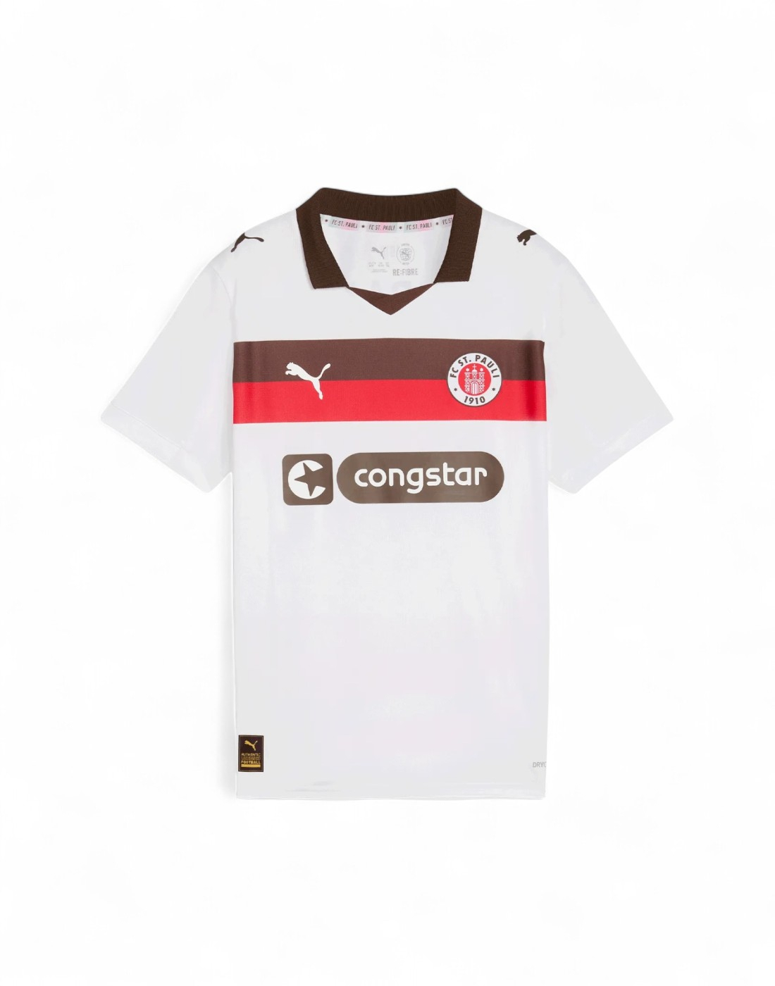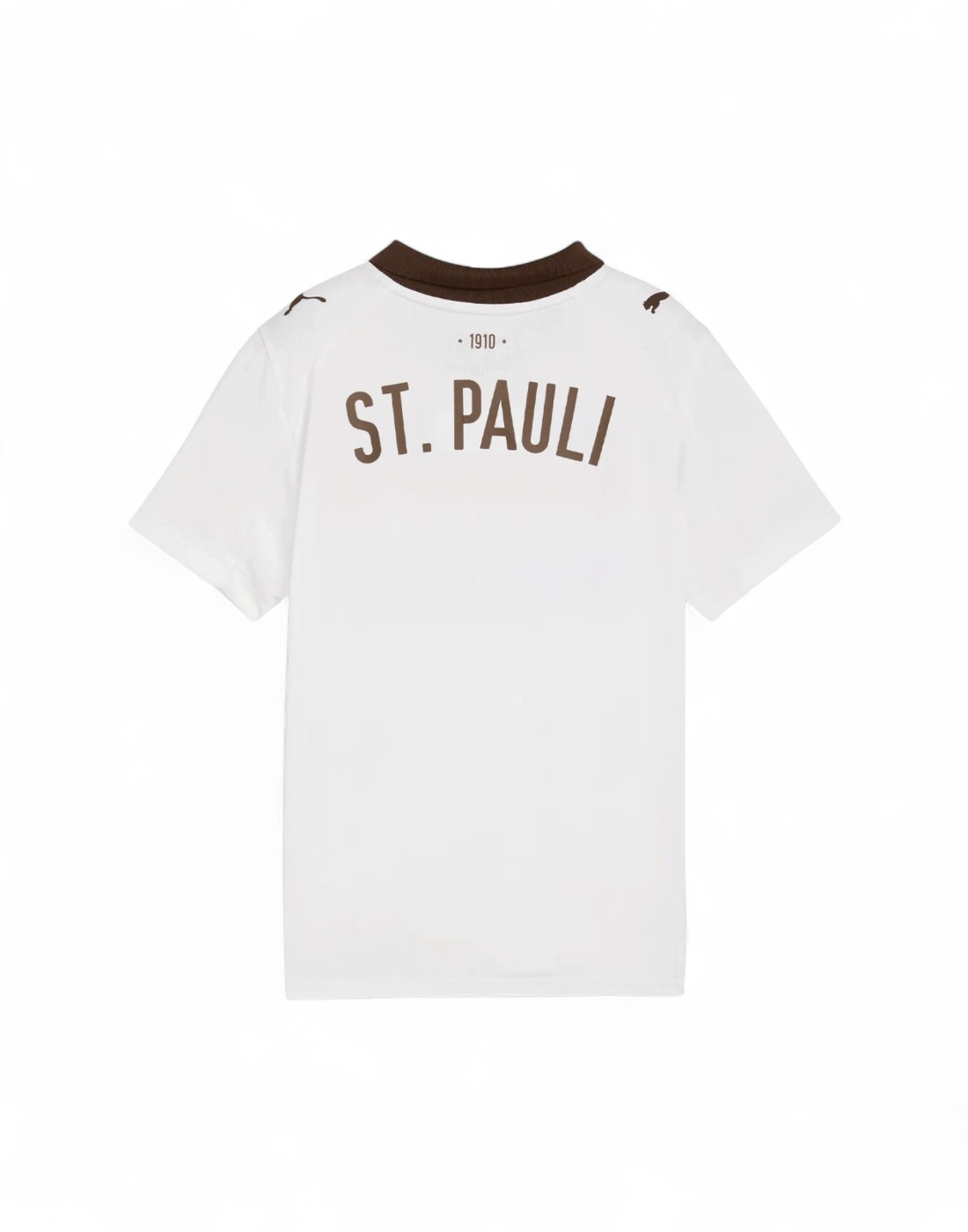 Von St. Pauli in die Welt – unser neues Auswärtstrikot für Kinder zur Saison 25/26! Der FC St. Pauli und PUMA präsentieren das neue Kinder-Auswärtstrikot für die Bundesliga-Saison 2025/26. Das schlicht weiß gehaltene Trikot wird in der anstehenden Saison von einem braun-roten Blockstreifen auf der Brust geziert und durch einen braunen Polo-Kragen abgerundet. Das neue Auswärtstrikot für Kinder in den klassischen Vereinsfarben verbindet dabei ein sportliches und professionelles Auftreten der kleinen Boys (and Girls) in Brown mit einem gleichzeitig zeitlosen, lockeren Look – für den nächsten Stadionbesuch, den Bolzplatz oder den Alltag im Viertel. Das Trikot besteht wie gewohnt zu 100 % aus recyceltem PUMA RE:FIBRE-Material und ist somit ein klares Bekenntnis zur Nachhaltigkeit. Da es sich beim Aufbringen der Beflockung und Logos um kein maschinelles Verfahren, sondern um Handarbeit handelt, kann es zu Abweichungen zur Abbildung, Positionierung und Schriftgröße kommen. Trikots mit Ziehfäden sind kein Reklamationsgrund. Spieler- und Individuelle-Beflockungen, sowie Logos können eine Lieferzeit von 10-14 Werktagen haben.
