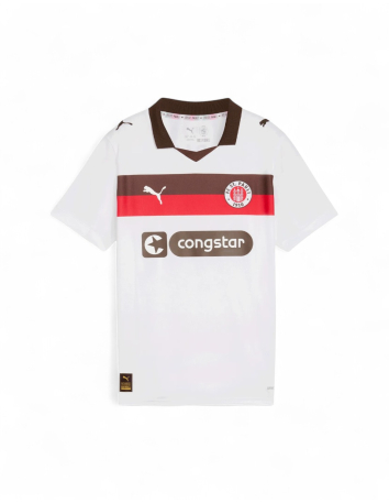 Last items in stock Jerrseys - No Borders St. Pauli - Jersey - 2024/25 - Away - White €80.00 FCSP x PumaColour: White / Brown Material: 100% recycled polyester FCSP Sustainable Product: Sustainable material large congstar front print FCSP logo on the left chest - Puma logo on the right chest Add to cart