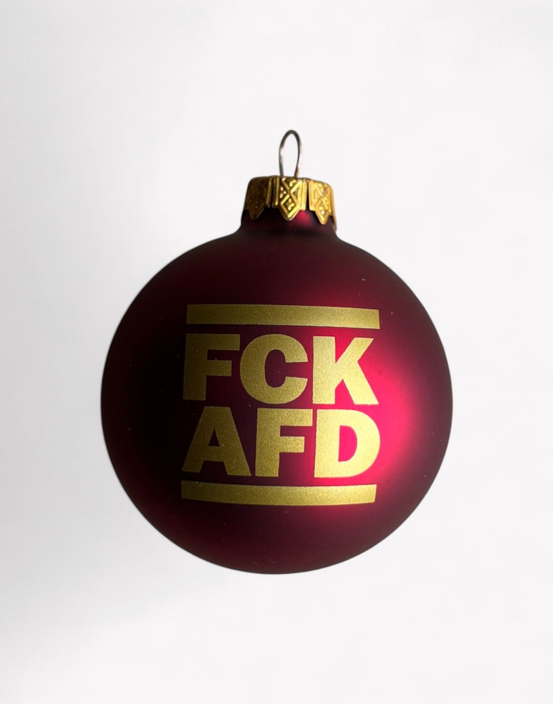 For anyone looking for an alternative to traditional Christmas decorations and wanting to make a small statement, our Christmas tree baubles are the perfect choice. The FCK AFD-Christmas tree baubles are made of glass and have a diameter of 66 mm. In terms of Christmas decorations, they are high quality and are ideal for embellishing your Christmas décor.