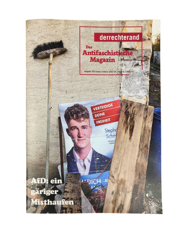 Last items in stock Zeitschriften Der rechte Rand 200 - Januar/Februar 2023 €3.50 AfD: ein gäriger MisthaufenAusgabe: 200 Erscheinungsdatum: Januar/Februar 2023 Jahrgang: 34 Hrsg.: Verein Bildung & Publizistik Seiten: 52 Add to cart