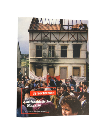 (Anti-)Rassismus Der rechte Rand 202 - May/June 2023 €3.50 Brandanschlag auf Solingen & die "Neue Rechte" Ausgabe: 202 Erscheinungsdatum: Mai/Juni 2023 Jahrgang: 34 Seiten: 40 ISSN: 1619-1404 Herausgeber: Verein Bildung & Publizistik V.i.S.d.P.: Alexander Hoffmann Add to cart