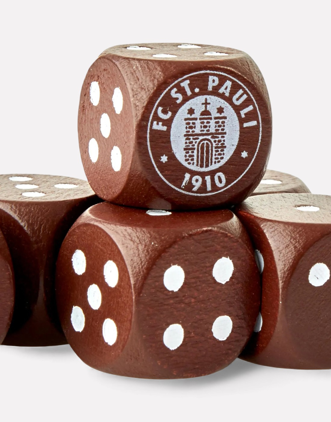 Handy dice cup with the FC ST. PAULI club crest, made of leather and without chrome. The six eye dice in classic white-brown are made of sustainable, FSC-certified wood. With the club crest instead of the "six" is also always an extra portion of luck in the cup.