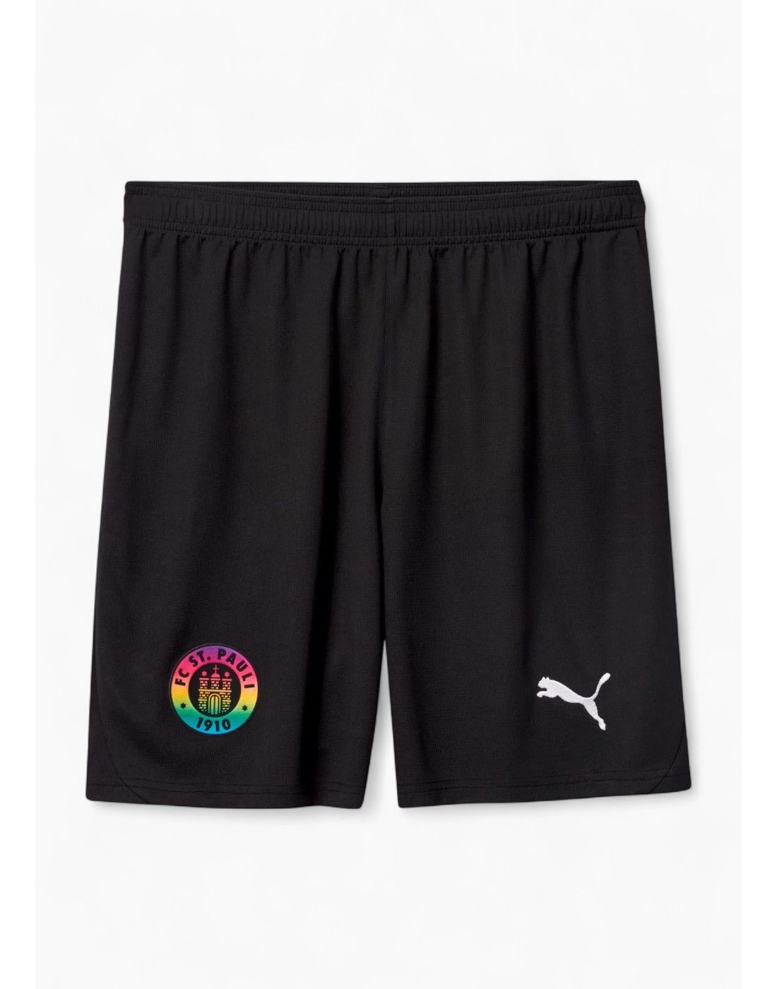The front of the shorts features the FC St. Pauli logo in rainbow colors and the Puma logo. These symbols emphasize the club's support for diversity and tolerance.